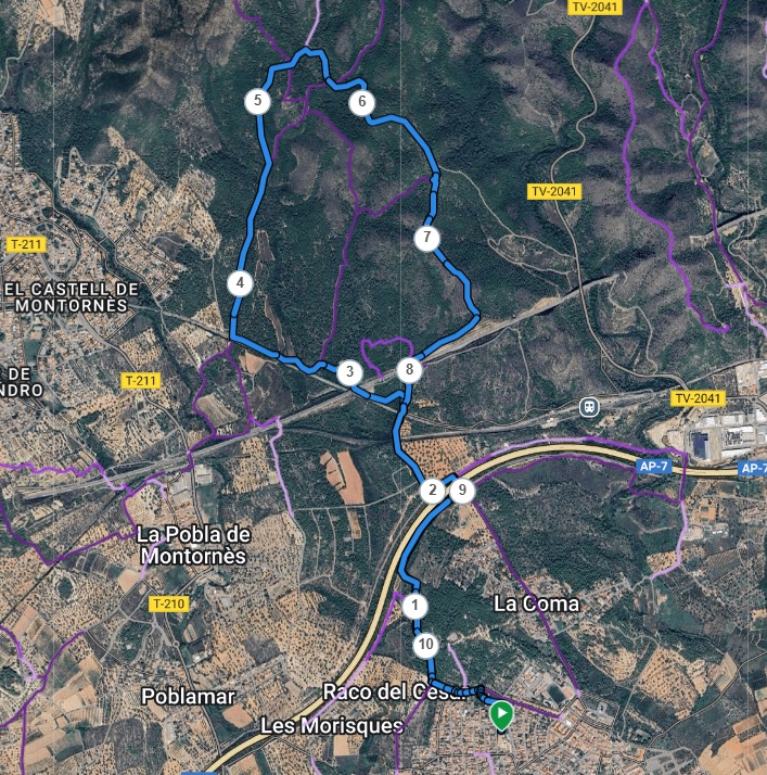 El descens es fa des de l'aguilera per uns corrios de pedres i pasarem sota el pont del tren i d'alla al sortir prendrem a uns 300m. d'asfalt estarem de nou a l'asfalt per baixa fins al pont sobre l'AP7 del que sortirem a la dreta per un camí de terra, mateix que em fet al inici.